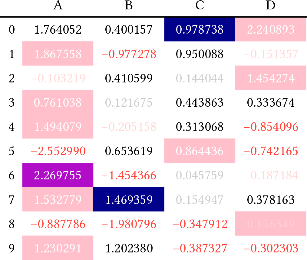 This example uses cell background colors to encode ranges of values.