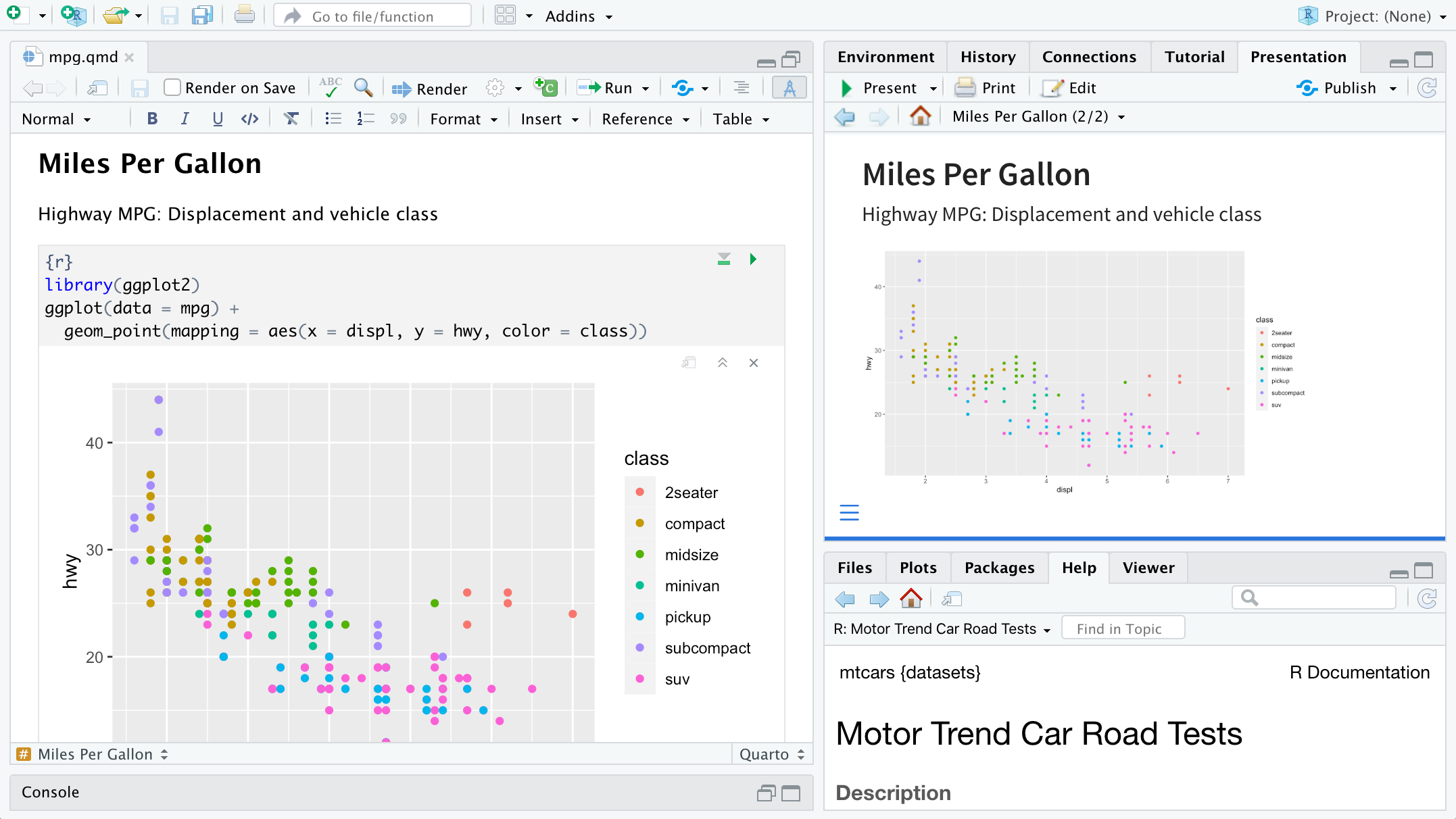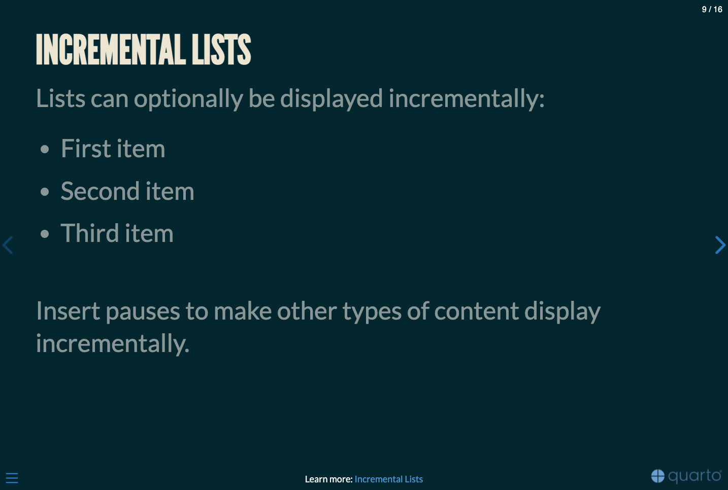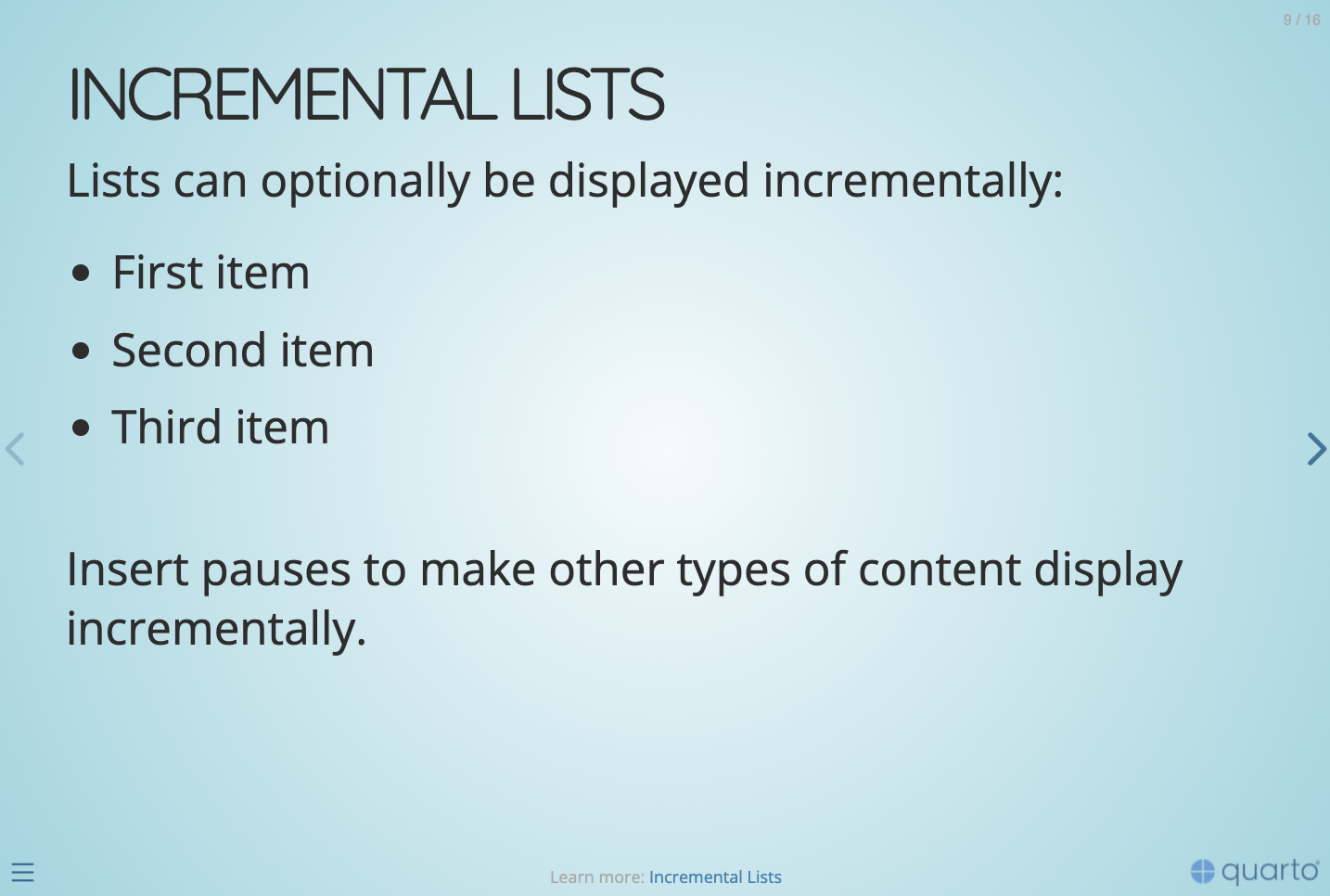 This presentation will show you examples of what you can do with Quarto and Reveal.js, including: